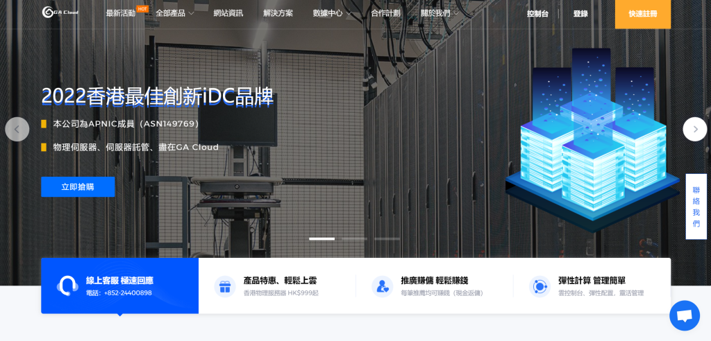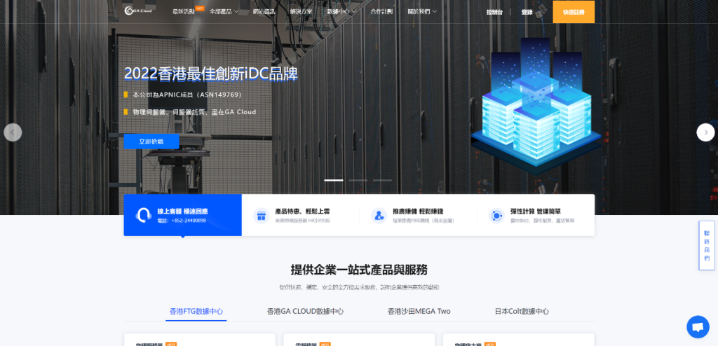今天介绍一下香港本地商家品牌GA Cloud,恭喜一下在今年正式成为了APNIC的成员了ID:GCTKL-AS-AP(AS149769),GA Cloud是GA Cloud Technology (Hong Kong) Limited旗下的一个云计算品牌,主力是提供香港特区的数据中心(机房)服务、服务器托管、机柜租用、带宽租用、物理服务器租用、云服务器租用、IPv4/IPv6租用、技术支援等服务。