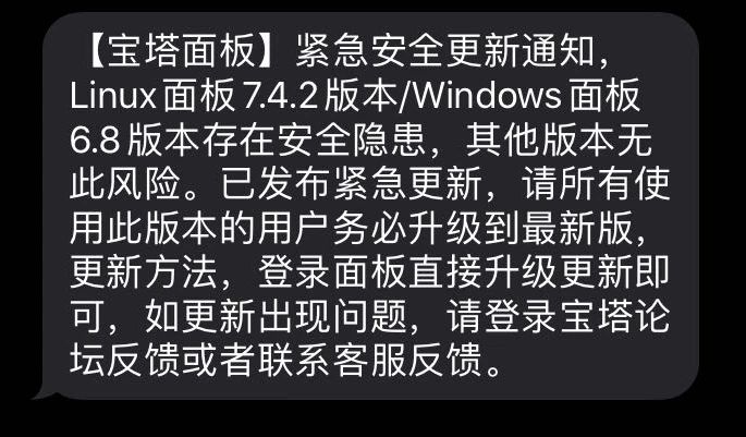 随后开发商宝塔安全也紧急发布通知短信告知: