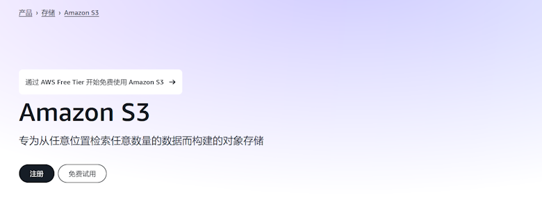 亚马逊云的 S3 的免费套餐提供 12 个月的免费试用期,每个月提供 S3 Standard 存储类中的 5 GB Amazon S3 存储空间、20000 个 GET 请求、2000 个 PUT、COPY、POST 或 LIST 请求以及 100 GB 的数据传出量。如果我们还不是亚马逊云科技的用户,可以注册一个账号,注册后就拥有100+的免费云服务,包括 12个月的基础S3对象存储,可以满足我们日常基础的业务用途,比如我用来搭建外贸网站的图片附件和服务器程序分离的。