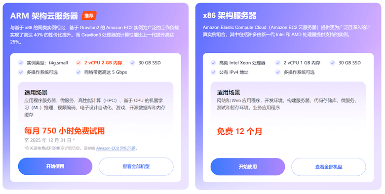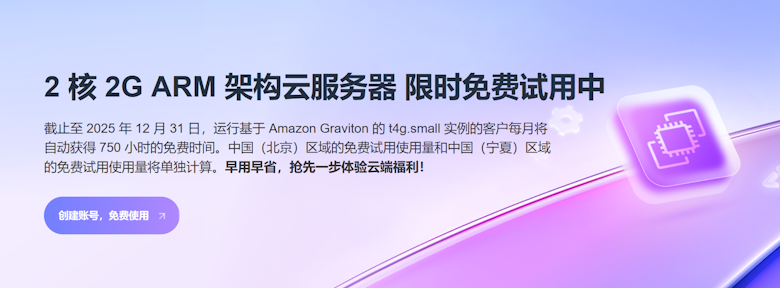 截止至 2025 年 12 月 31 日,运行基于 Amazon Graviton 的 t4g.small 实例的客户每月将自动获得 750 小时的免费时间。中国(北京)区域的免费试用使用量和中国(宁夏)区域的免费试用使用量将单独计算。