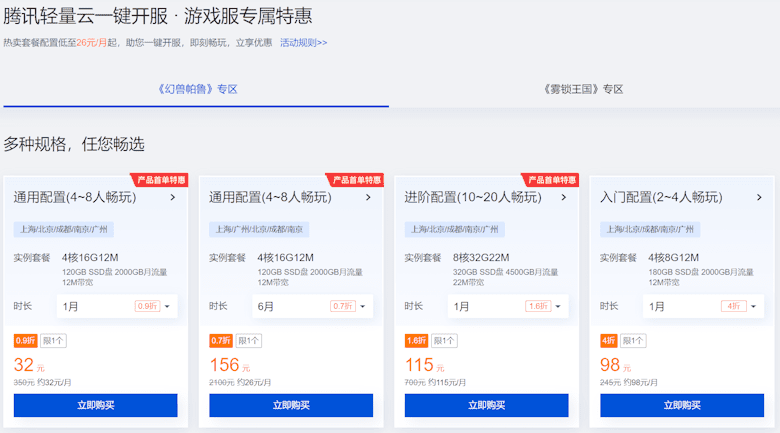 在前面的文章中我也有介绍到,腾讯云有推出专属于PalWorld的游戏服务器,毕竟游戏服务器和普通服务器不同,前者配置要高一些的,当然根据不同的用户在线玩家人数,要求的配置还是不同的。