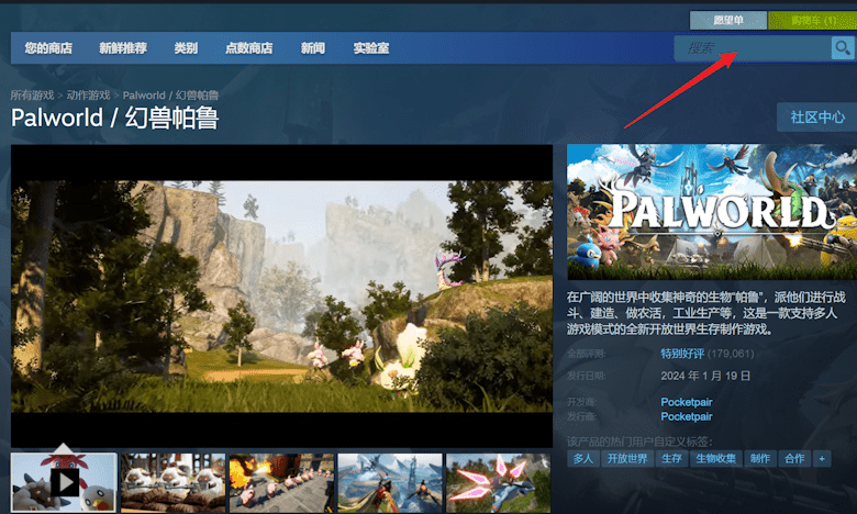 我们直接在Steam客户端搜索 Palworld,或者是在PC端打开:这里。购买幻兽帕鲁游戏,支持支付宝和微信付款的。