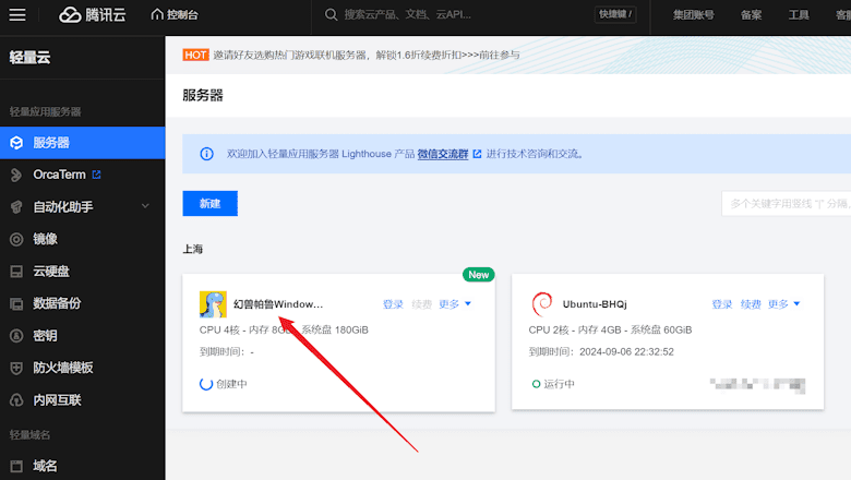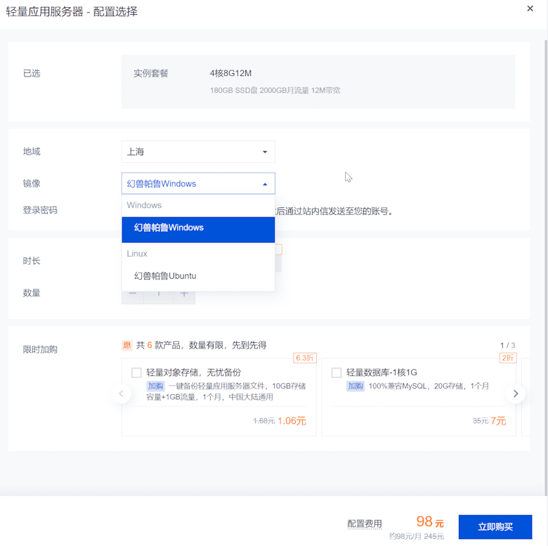 我们在选择服务器机房的时候,可以镜像选择幻兽帕鲁镜像,这里我选择WIN镜像,这边便于以后去服务器端配置信息。机房根据我们自己需要,我选择离我们近的上海机房。