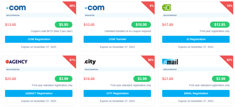 黑五期间,截止到11月27日(北京时间11月28日)新注册COM域名5.95美元,相对便宜的。优惠码:BF23,限量每个账户5个域名。当然,还有其他域名可选新注册优惠,比如.ME、.NET等。