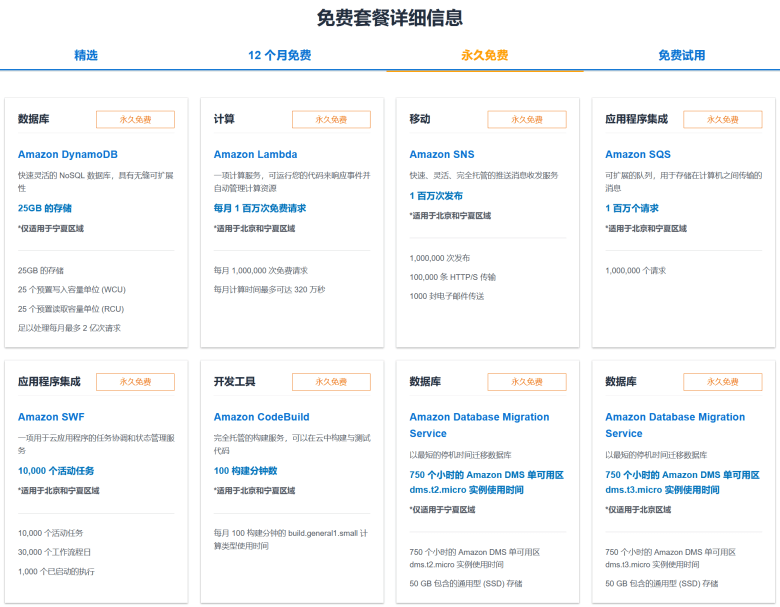 我们可以看到亚马逊云中国区有提供12个月、永久免费和短期试用体验的云产品。
