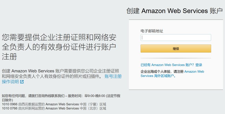 亚马逊云中国区:https://www.amazonaws.cn/free/