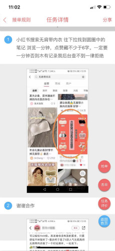 点完截图传到后台验证打款,如果浏览低于1分钟会自动拒单(有的人会秒点直接截图,这句话威胁一下,防止不浏览点赞,如果发现过多人秒截图,可以让他截图两张,第一张是进入笔记的,第二张是两分钟后点赞的)。