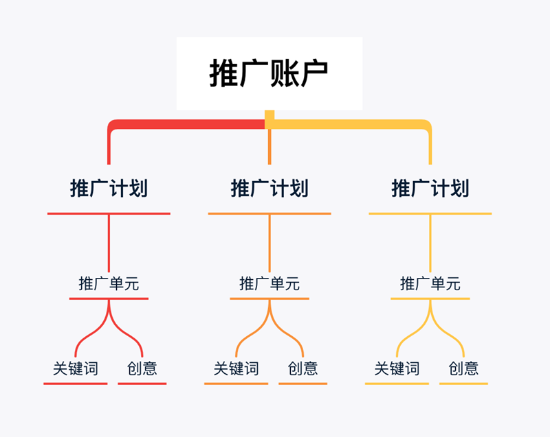 百度搜索推广账户结构由推广账户、推广计划、推广单元、关键词和创意四个层级构成,其中关键词和创意同为一个层级。