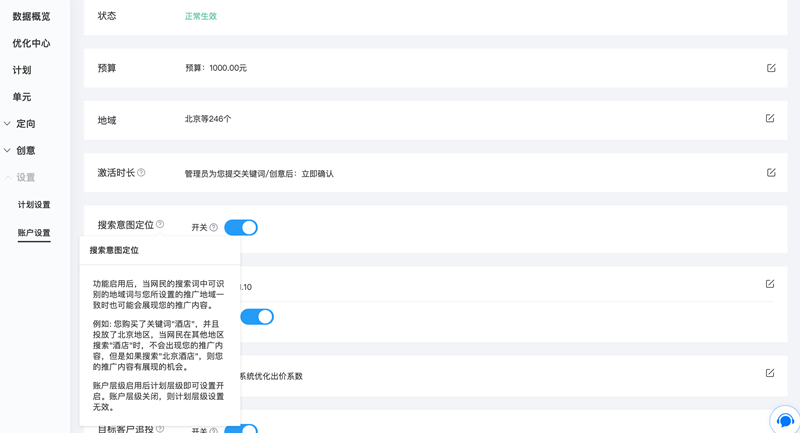 正常来讲,当企业设置好推广地域后,创意只能在设置的相应地区展现,但“搜索定位功能”可以设置地域以外的意向网民找到企业。单击“推广地域设置”按钮后,在页面最下方打开“搜索意图定位功能”。