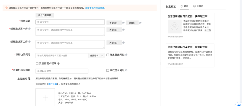 善用通配符,通配符是创意中能够替代单元内所有关键词的符号,可以增加创意飘红概率和点击率,使用标志为“{默认关键词}”,其中的“默认关键词”可以替换为任意一个单元内已有关键词。在编写创意时,标题、描述都可以插入通配符,被插入通配符的部分在账户的预览图中飘红。