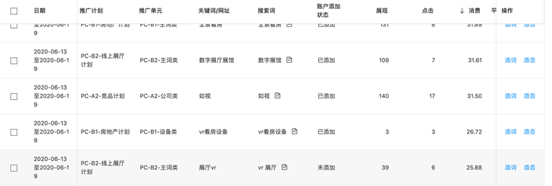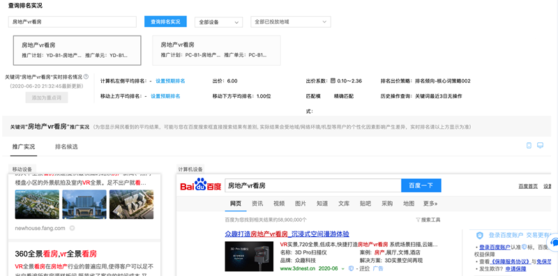 假设账户关键词为“VR看房“,推广地域设置为”北京“。