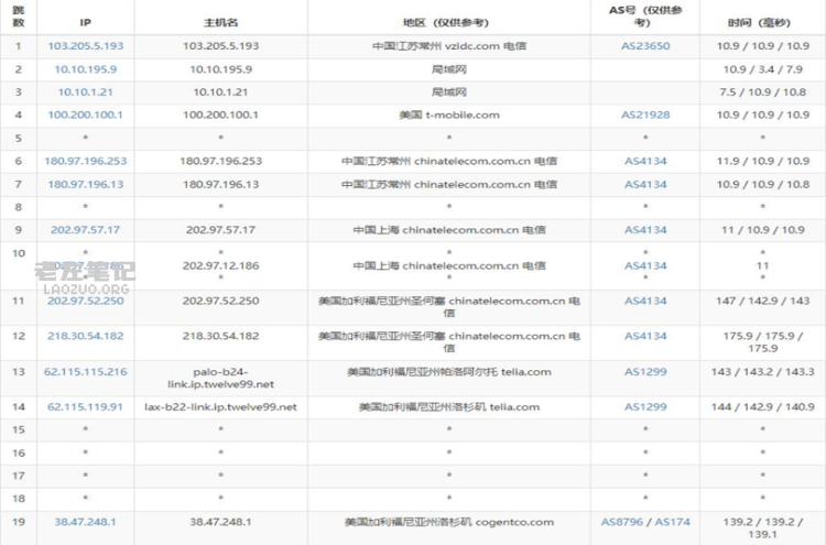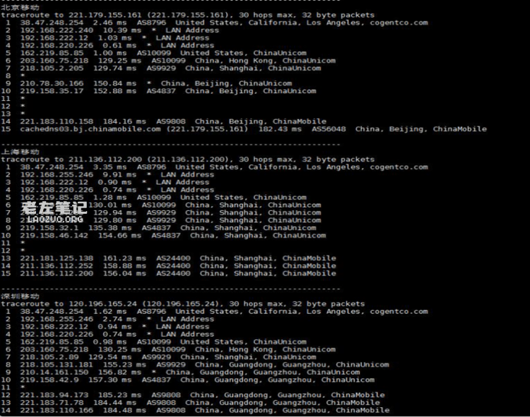 移动去程路由是从上海网口出去,然后直连洛杉矶机房。
