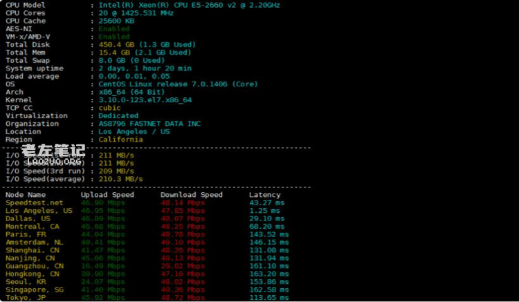 可以看到服务器采用的是E5-2660 V2.2G的10核20线程处理器(也有20核40线程可选),磁盘V/O在210MB/秒左右,可以确定使用的是SSD固态硬盘,上传和下载速度都跑满了50Mbps,相当的不错的。