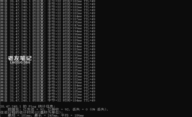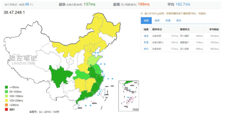可以看到本地Ping的延迟效果在184ms左右,这个延迟对于美国机房来说算是比较低的了。我们再看看全国Ping的延迟效果,如下所示:
