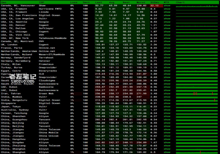 可以看到三网Ping的平均延迟在162ms左右,可以看到电信和联通网络延迟差不多在160ms左右,移动网络稍微高点在185ms左右,不过延迟还是很低的。所以从延迟效果来看还是相当不错的。接下来我们再看看全球各节点的网络稳定性情况,如下所示: