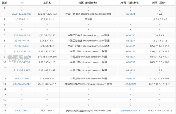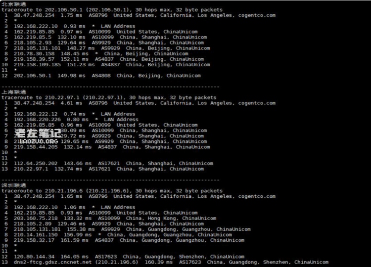 联通去程路由是从上海网口出去,然后直连洛杉矶机房,并且走的是AS4837线路转AS9929的联通优化线路。