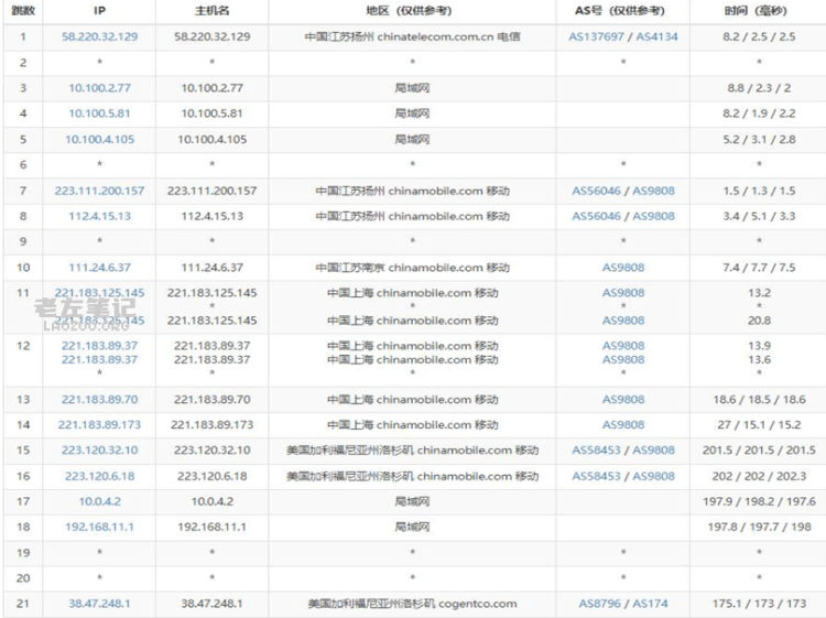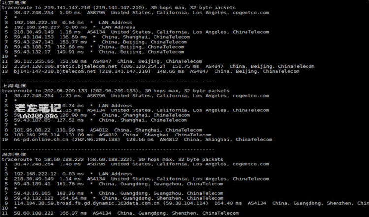 可以看到全球各地网络稳定性都是相当不错的,不管是国内还是国外都基本没有丢包的情况,欧美地区除了网络稳定外,延迟都还是非常低的。下面我们看看三网的去程路由线路。