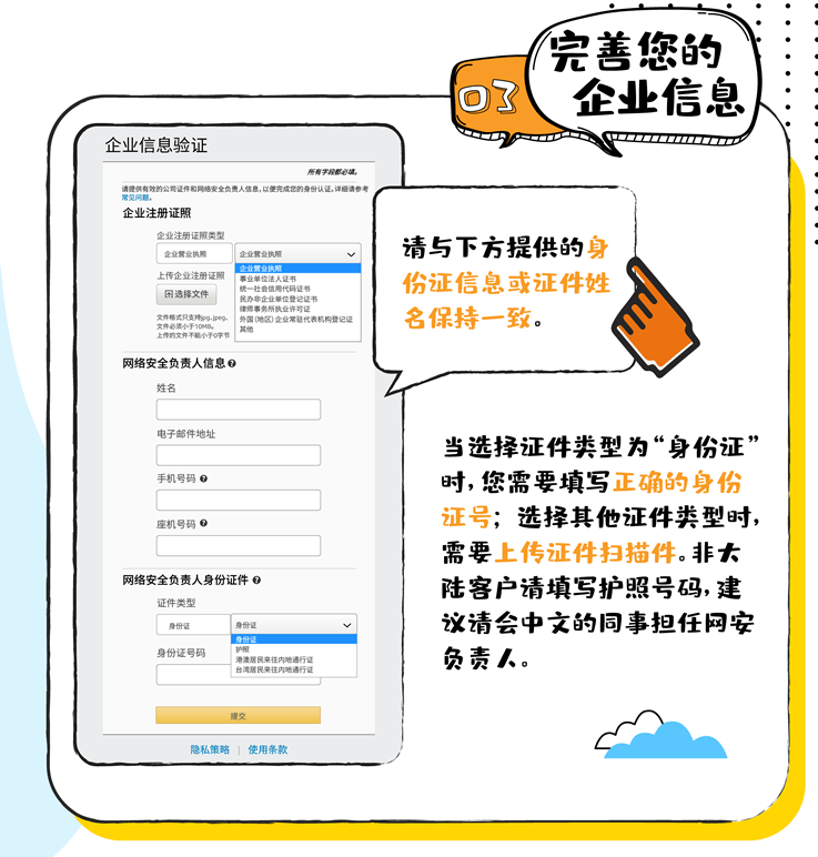 根据提示,我们需要提交企业营业执照,包括我们网络负责人。看来亚马逊云进入中国市场还是做好准备的,这些应该是符合政策要求的。
