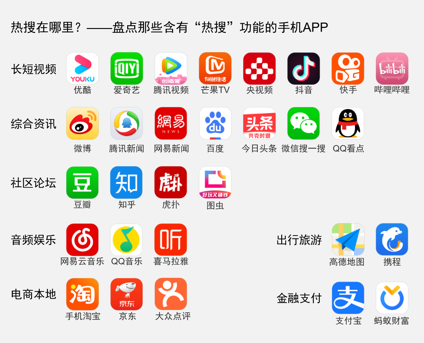 时至今日,各大流量平台,从长短视频到综合资讯,从社区论坛到音频娱乐,从电商到出行,从本地生活到金融支付,都慢慢地开始了在热搜上的布局,热搜貌似成了流量平台的标配。