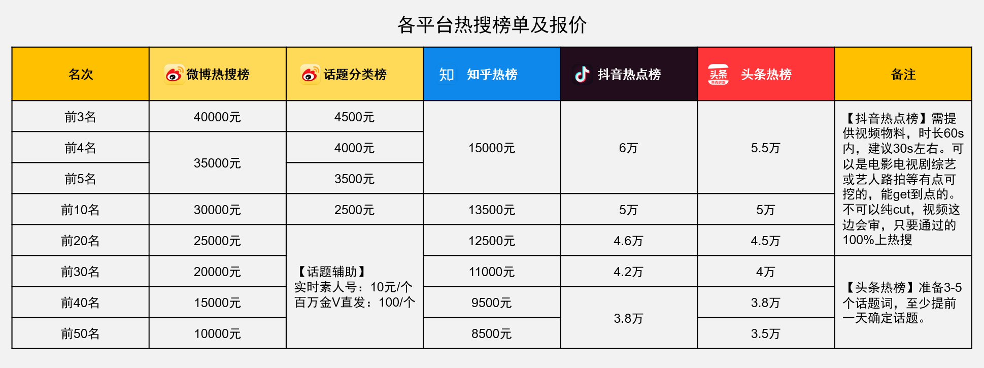 有流量就有曝光,有曝光便有商机。热搜给平台带来流量的同时,也带来了如热搜广告位,撤热搜,明星买话题等等一系列商业变现的途径。这是一张网传的热搜报价图,各个流量平台,各个热搜名次,明码标价。
