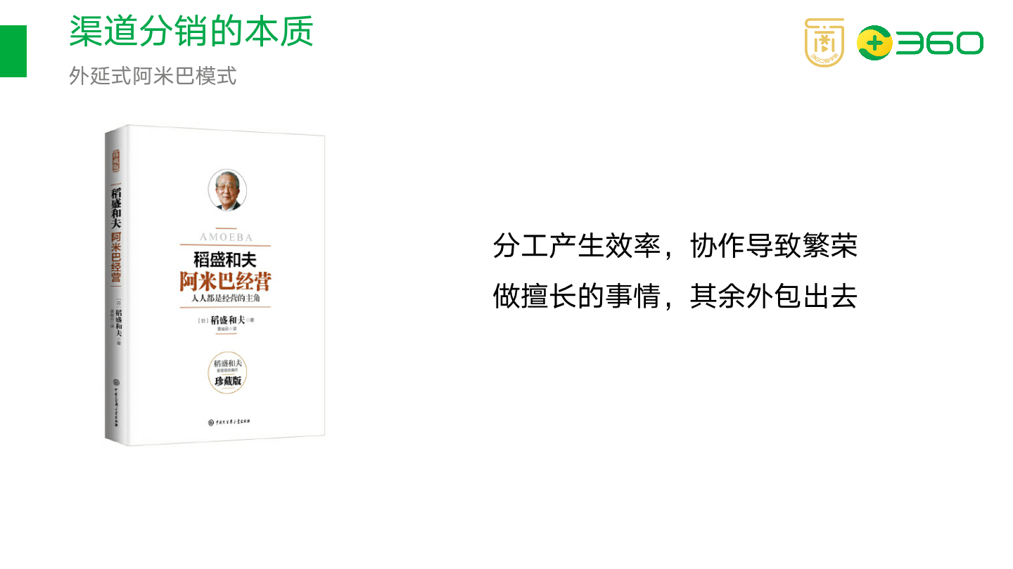 前一段时间,刘润老师和曹氏父子关于阿米巴模式的争论很激烈,从另外一个纬度来看,建立渠道商的模式是不是和阿米巴经营有异曲同工之妙,我把它称之为外延式阿米巴模式,渠道商是独立核算的超级个体,在应对市场时可以更加反应迅速地作出反应,更具活力与创新能力。