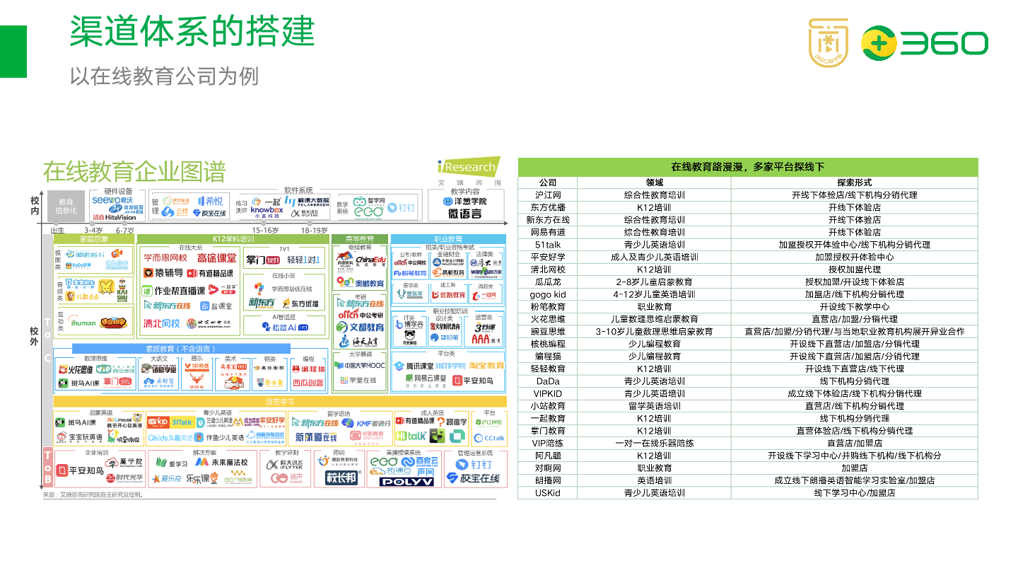 我们来看一下在线教育公司的图谱。从2020年开始,纷纷转向线下,主要的业务模式是渠道分销/代理/加盟店/体验店,这次的双减政策对各家业务冲击很大,他们纷纷将精力集中在线下,上面的一些可能已经解散了,市场有时候就是这么残酷,总有黑天鹅发生。