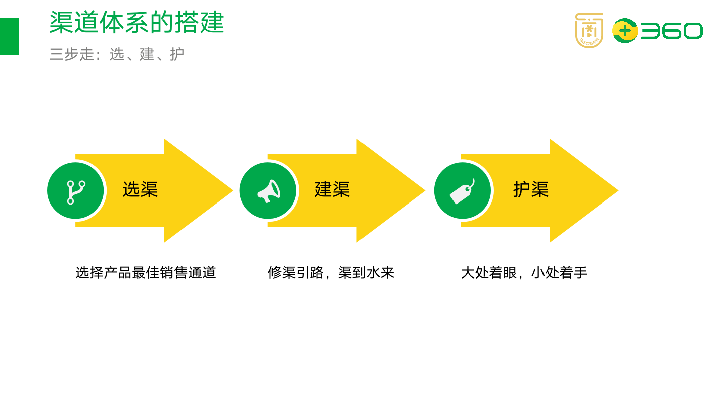 我一般将渠道体系的搭建分为三个模块:选、建、护,选择可以理解为,业务模型的选择、渠道政策的选择、伙伴的选择,建立是具体落地执行,最后是护,也就是渠道运营培训,这部分是最容易被忽视的地方。