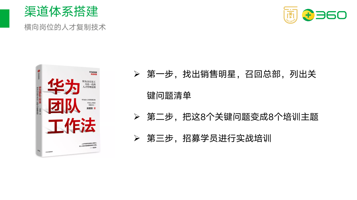 这是我们在渠道建设过程中可以借鉴的,将渠道面临的常见问题做好整理,与优秀渠道商一起探讨共性问题的解决办法,打造样板市场,将其中的解决思路和方案快速复制到全国,可以以更快的时间、更低的成本发挥渠道优势,从实战中获得大量经验与方法,最后通过分享培训的形式,将方法传授给所有人,最终形成销售能力。