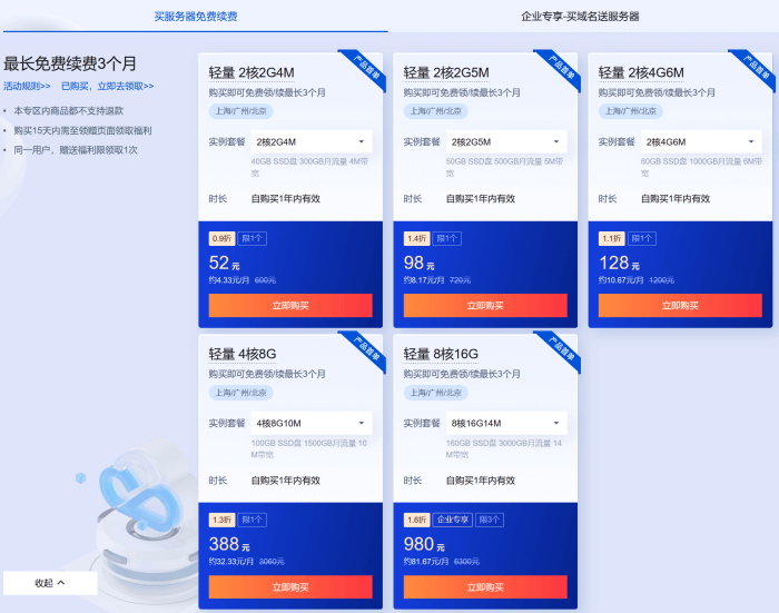 轻量服务器前几天是有三款的,现在看到有增加2款。一共五款轻量服务器适合产品首单活动,我们在选择后可以免费升级续期三个月或者一个月,以及我们可以单独申请一台免费的三个月或者一个月轻量服务器。企业用户是三个月,个人用户是一个月。