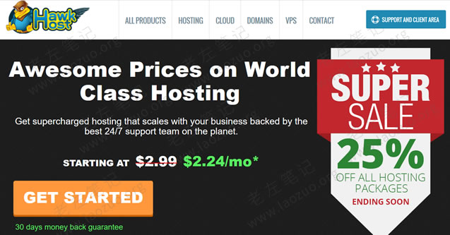 老鹰主机(HawkHost),这个主机商老左还是比较喜欢的,至今我也有在使用。每两年我会在黑色星期五购买一台新机器替换使用,当然是因为便宜稳定。这款主机商从2012年开始进入国内市场(应该是这个时候开始支持支付宝付款的),提供的虚拟主机性价比比较高。
