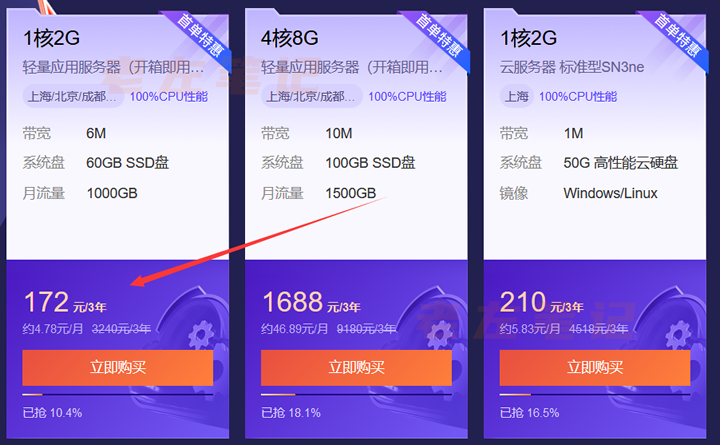 我们可以看到今年腾讯云双11活动秒杀活动是分2个时间,这个还算靠谱。至少让人看的明白。比如上午我们看到有三年172元的轻量服务器,6M2GB、1000GB流量配置。