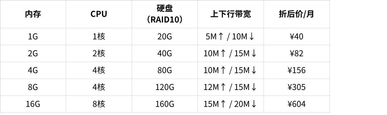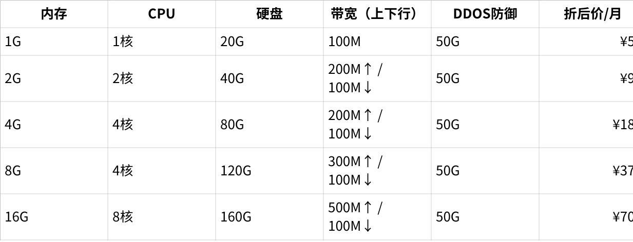 | 内存 | CPU | 硬盘 | 带宽 | 月流量 | 折后价/月 |