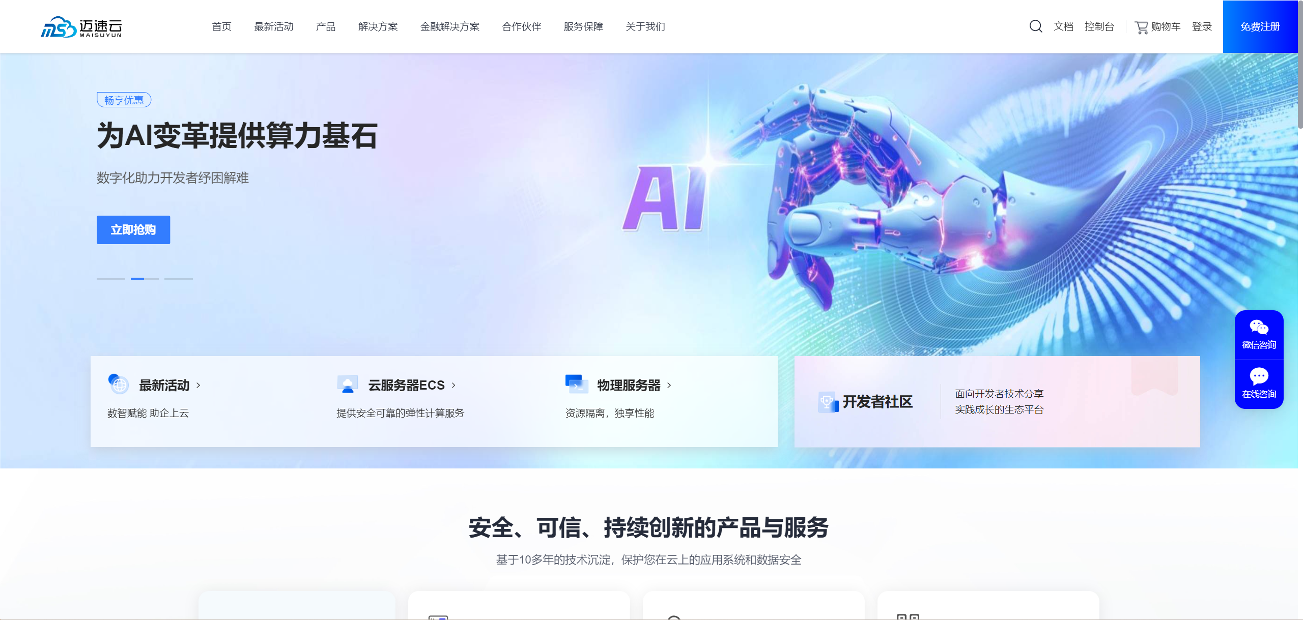 迈速云是一家专为中小型企业及个人站长服务的3年老牌云服务器运营商,成立于2023年。公司致力于提供快速、稳定、安全的云服务,帮助企业获得高效的动能。以下是关于迈速云的一些详细介绍: