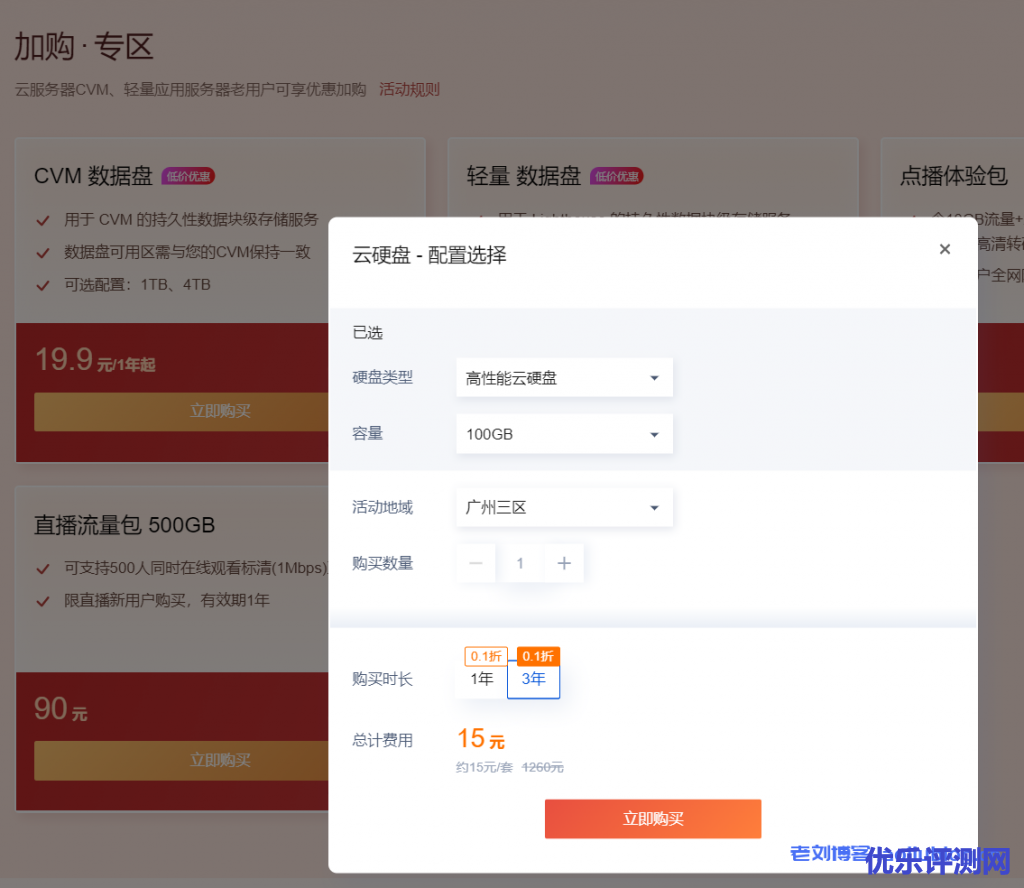 腾讯云新春采购可选CVM数据盘和轻量数据盘,其中轻量数据盘100G,3年仅需15元。