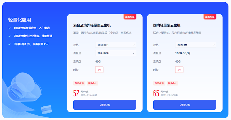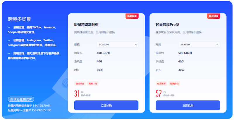 我们可以看到这里有2个套餐适合新客首单的,有港台和境外的机房和国内机房。
