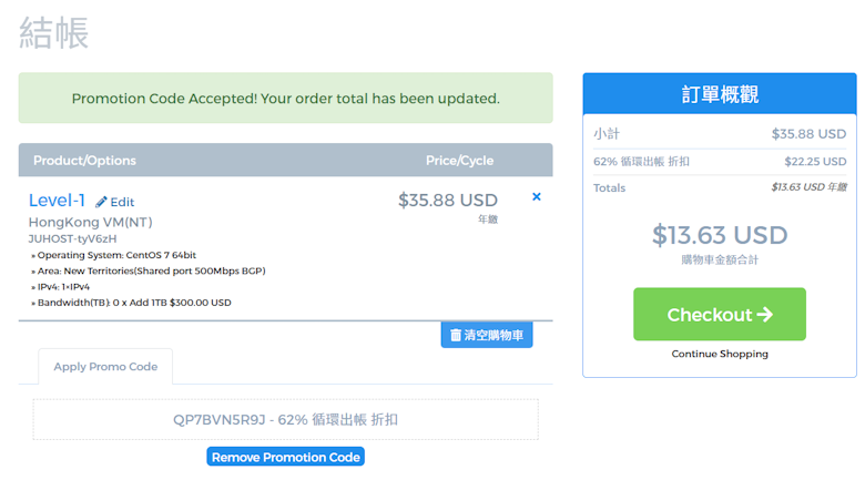 老左在前面有介绍到 JuHost 主机商是一个新晋的香港服务商有提供香港新界和日本数据中心,日常是有提供七折优惠活动的。这次的特价Level1套餐可以抵制3.8折,年付仅需要13.63美元,适合有需要入门机器使用的,可以选择日本和香港机房。