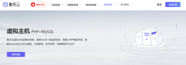 衡天主机来自国内的主机商,拥有域名注册、虚拟主机、云服务器,独立服务器等产品。机房也是丰富的,包括香港、美国、日本等,虚拟主机拥有香港机房,价格比较便宜。根据配置不同价格从年付200元左右起步,这个还是需要对比不同的配置是否适合。