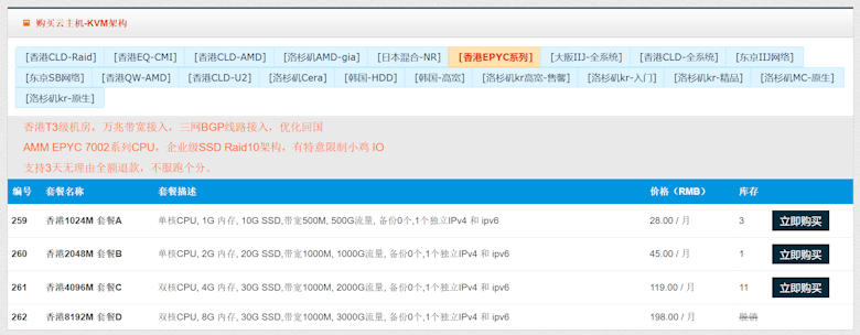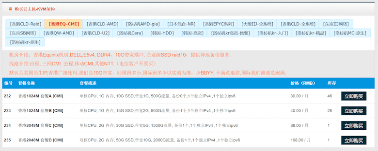 对于HostYun服务商来说我们有些朋友也是熟悉的,一个国内老牌的小众服务商,主打的就是一个便宜。而且随着机房的不断增加目前已经有超过10个机房,近期看到有新增香港EQ-CMI数据中心和香港EPYC系列产品。特点和以往的产品有些不同,主打的就是大带宽,我们可以看到最高10Gbps带宽的VPS主机,适合有需要大带宽业务。