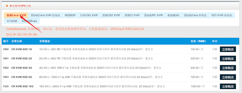 这里我们先看看80VPS的香港CeRa VPS的套餐。