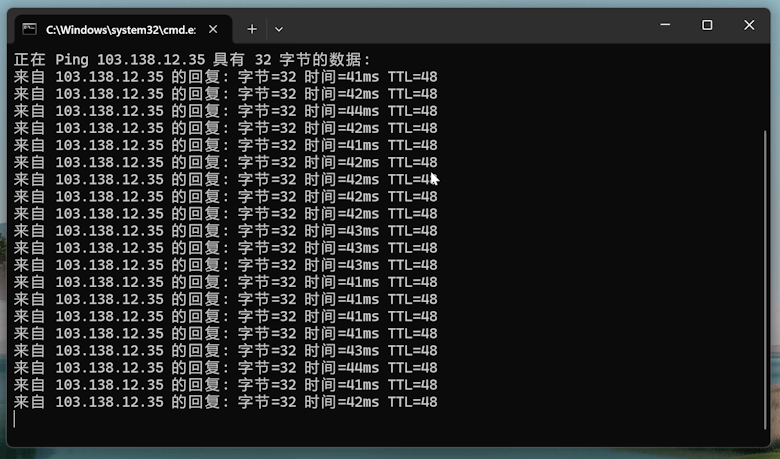 这里我本地的PING速度测试可以看到大约的PING速度在40ms左右,这个速度对于香港机房来说还是比较好的,毕竟是优化线路。