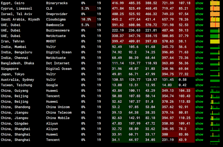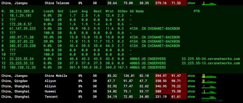 然后我们在全球节点的PING测速,这里可以想象到除了亚洲速度还不错,其他欧美肯定速度一般的。我们可以看到亚洲节点的丢包率还是相当不错的。
