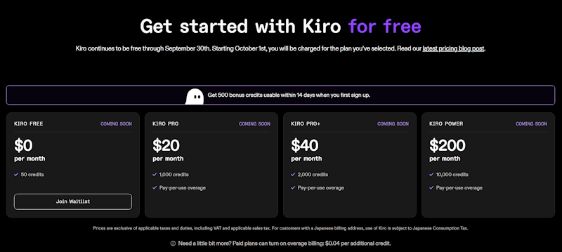 在我们体验Kiro IDE工具之前,看看具体的定价。