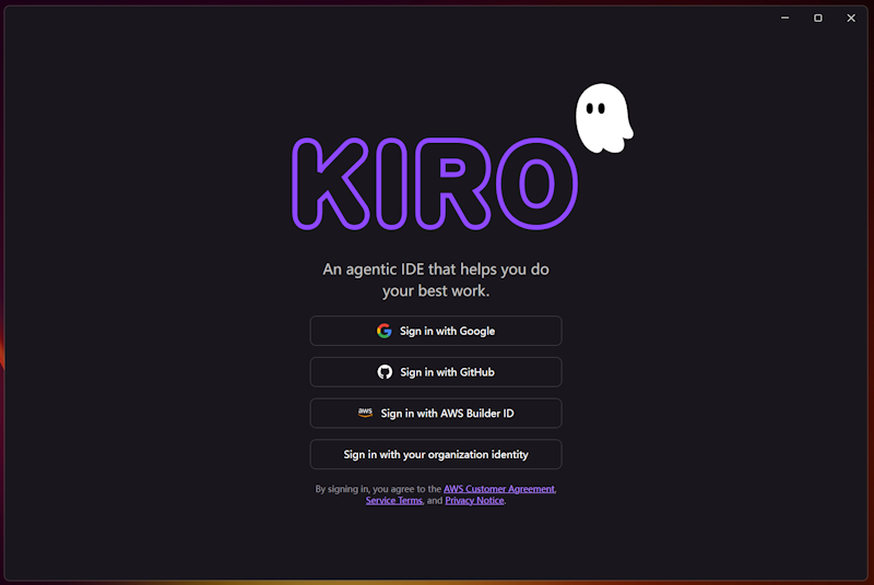 从官网下载最新版本的Kiro后安装,如上图所示。有支持MacOS、Windows、Linux系统,然后打开软件后支持用多个账号连通登录。