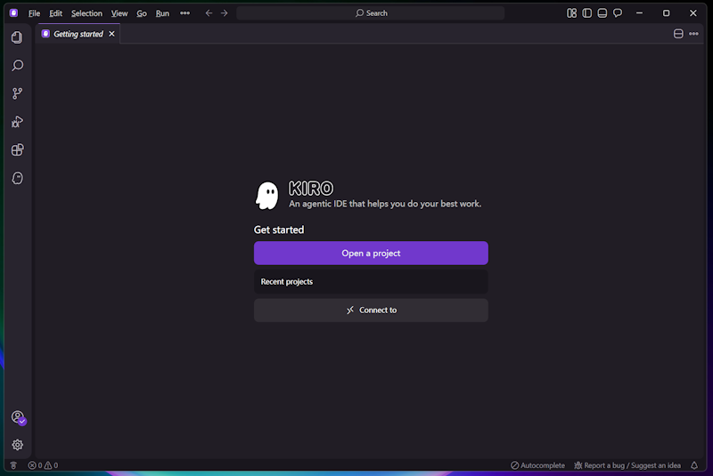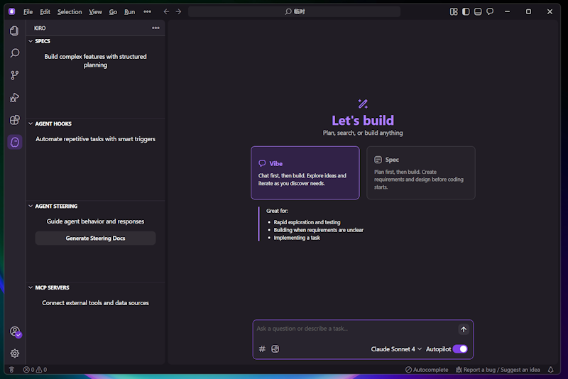 如上图,我们可以看到登陆到 Kiro 的主界面,如果我们用过VS CODE或者是Trae,界面基本上一样的。