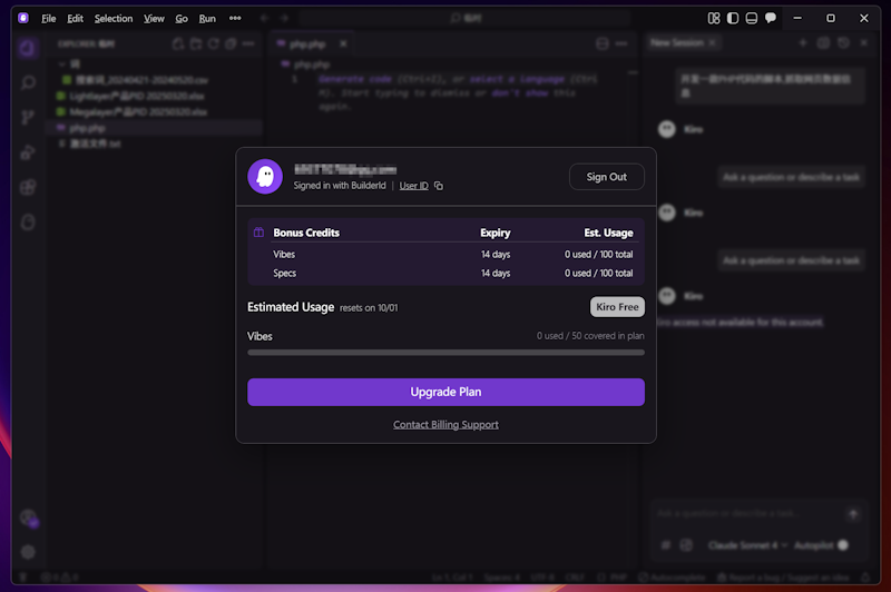 我们可以看到 Kiro IDE 拥有4个套餐计划,基础套餐每月免费50 credits,目前截止到9月30日,将获得500额外credits(14天内有效),后面根据计划从10月1日开始会有全新的订阅计划执行方案,具体以实际为准。那在这里,我们也体验看看他们的这个产品。