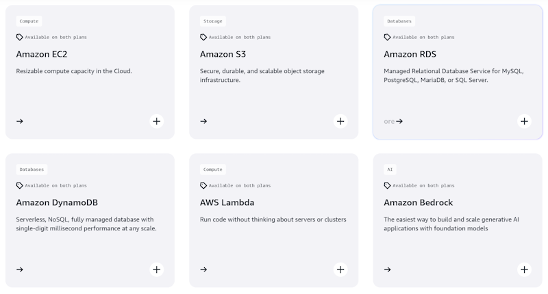 | 付费计划 | 使用超过 150 项 AWS 服务,开发生产就绪型工作负载 ✔ 获得高达 200 美元的服务抵扣金 ✔ 包括免费使用精选服务 ✔ 超过服务抵扣金阈值时付费 ✔ 工作负载规模超过服务抵扣金阈值 ✔ 访问所有 AWS 服务和功能 |