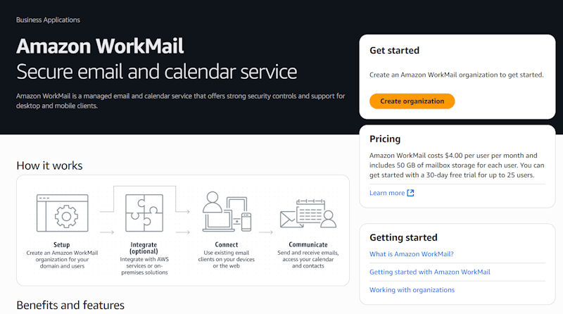 亚马逊WorkMail的收费是每个用户每月4.00美元,每个用户的邮箱存储空间为50gb。你可以开始30天的免费试用,最多25个用户。如果我们还没有注册过亚马逊云科技的账号,注册后还可以得到免费12个月的EC2服务器,以及其他100+款的免费云产品体验。