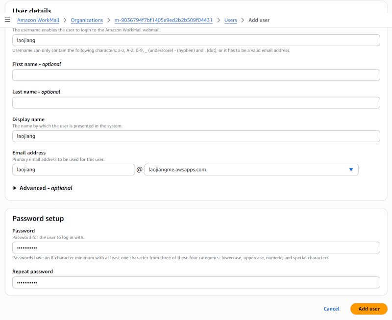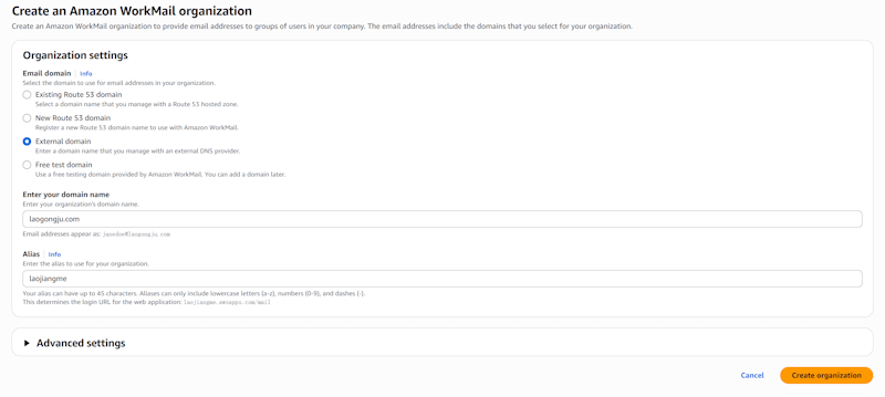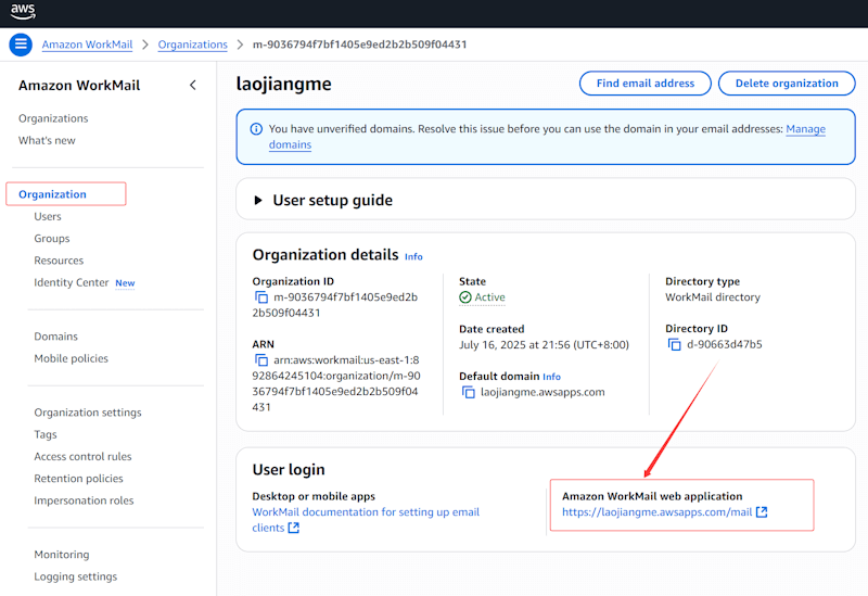 在亚马逊云科技也有提供Amazon WorkMail邮局服务,我们可以将自己个人或者企业域名绑定之后,拥有自己的企业邮局。