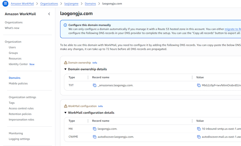 如果我们开始就直奔目标,比如我这里是用外部在腾讯云的域名的,就添加外部域名后进入当前新创建的组织。在 Domain 看到我们的域名需要添加解析验证,我们需要都添加到域名解析,添加后需要等待比较久的时间等待验证成功。如果我们域名是用的在亚马逊云科技注册的域名或者是域名托管在这里的,就可以一键添加后验证成功比较快速。