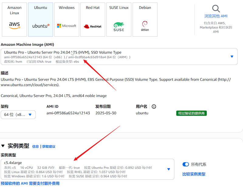 我们在开通EC2服务器的时候,需要选择配置较高的实例,且对应的系统也是有要求的。根据Qwen-7B-Chat大模型的配置要求,至少需要16G内存、100GB的磁盘,所以我们在配置EC2服务器的时候要达到要求,否则你无法运行安装。